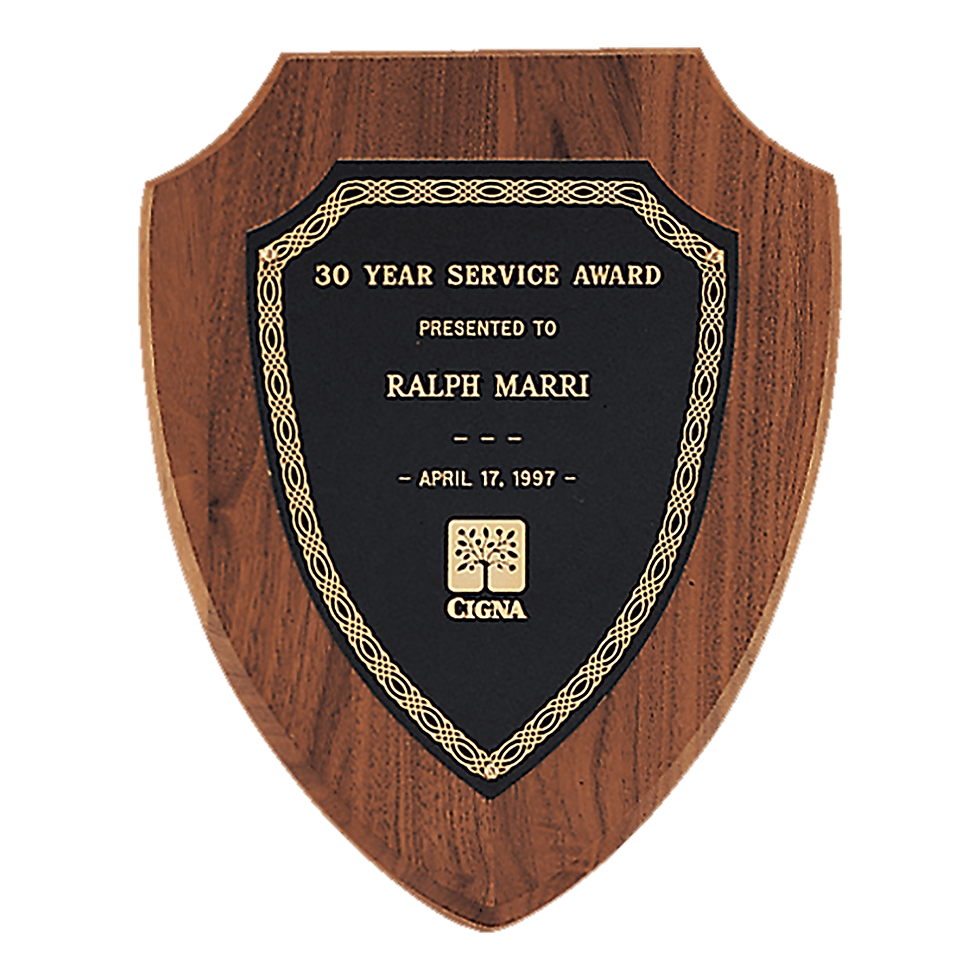 10" x 12" Jewelers Black Laserable Gold Border Shield Plate on an American Walnu